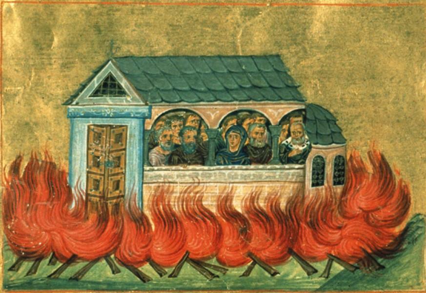 Христијаните, околу дваесет илјади, се крстија и се миропомазаа пред да бидат опкружени со пламенот. Црквата беше запалена од сите страни, и народот воспевајќи ја славата на Бога, почина во огнот. Пет дена пламенот гореше, а од црквата се креваше чад со опоен мирис и златозарна светлина.
