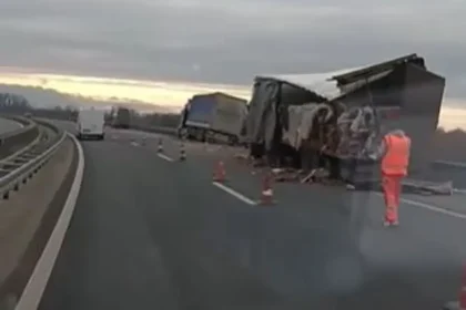 (ВИДЕО) ТЕШКА СООБРАЌАЈНА НЕСРЕЌА НА АВТОПАТ: Се судрија два шлепера, делови расфрлани по коловозот!